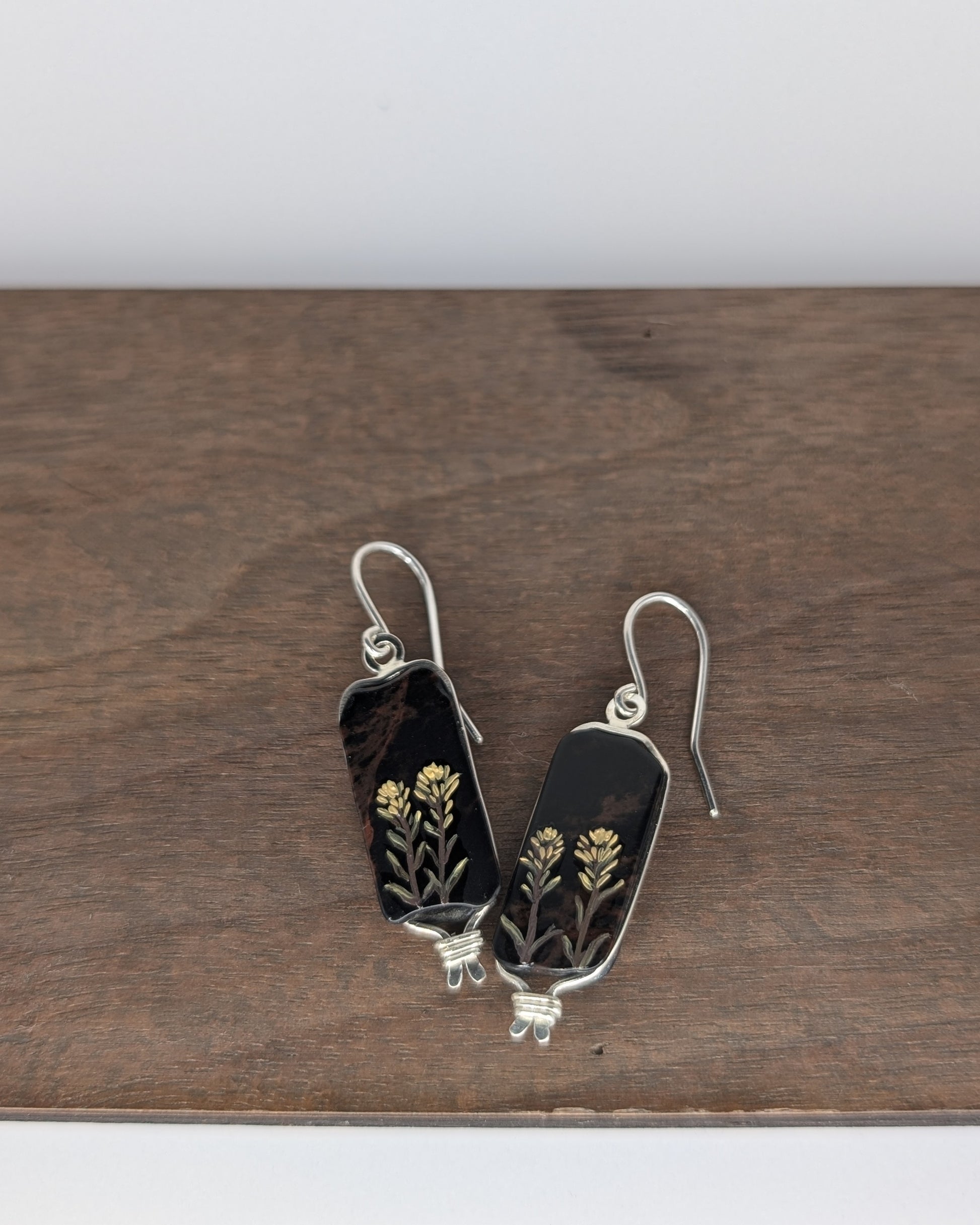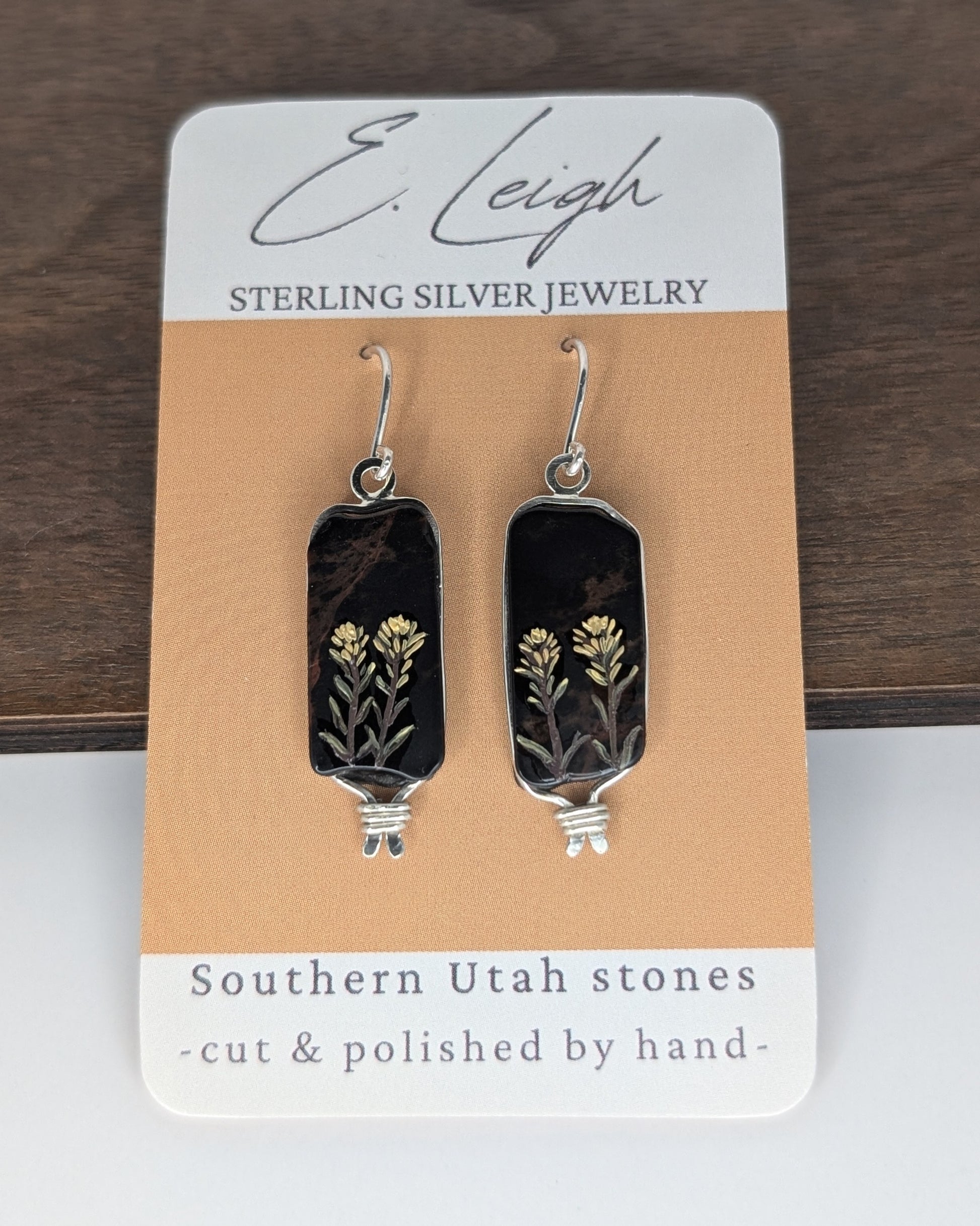 Hand-painted Indian Paintbrush flowers on wide obsidian rectangles with naturally curved edges. The stones were collected by hand in Southwestern Utah, cut and shaped in-studio, then painted with oil and sealed with Gamblin varnish for lasting wear.