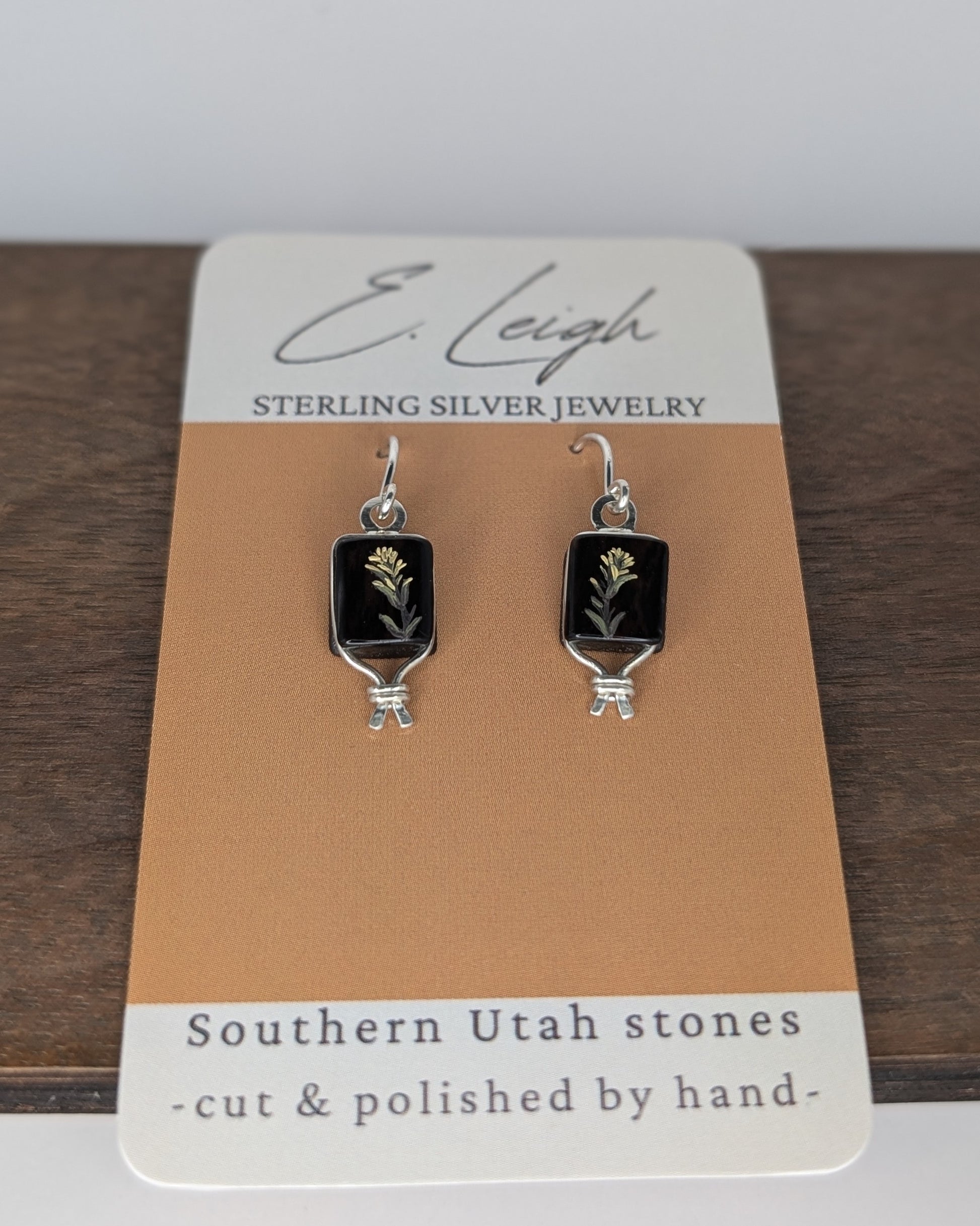 Hand-painted Indian Paintbrush flowers on small, square obsidian stones. Each piece is made from stones personally sourced in Southwestern Utah, shaped by hand, painted with oil paint, and sealed with Gamblin varnish to protect the artwork.