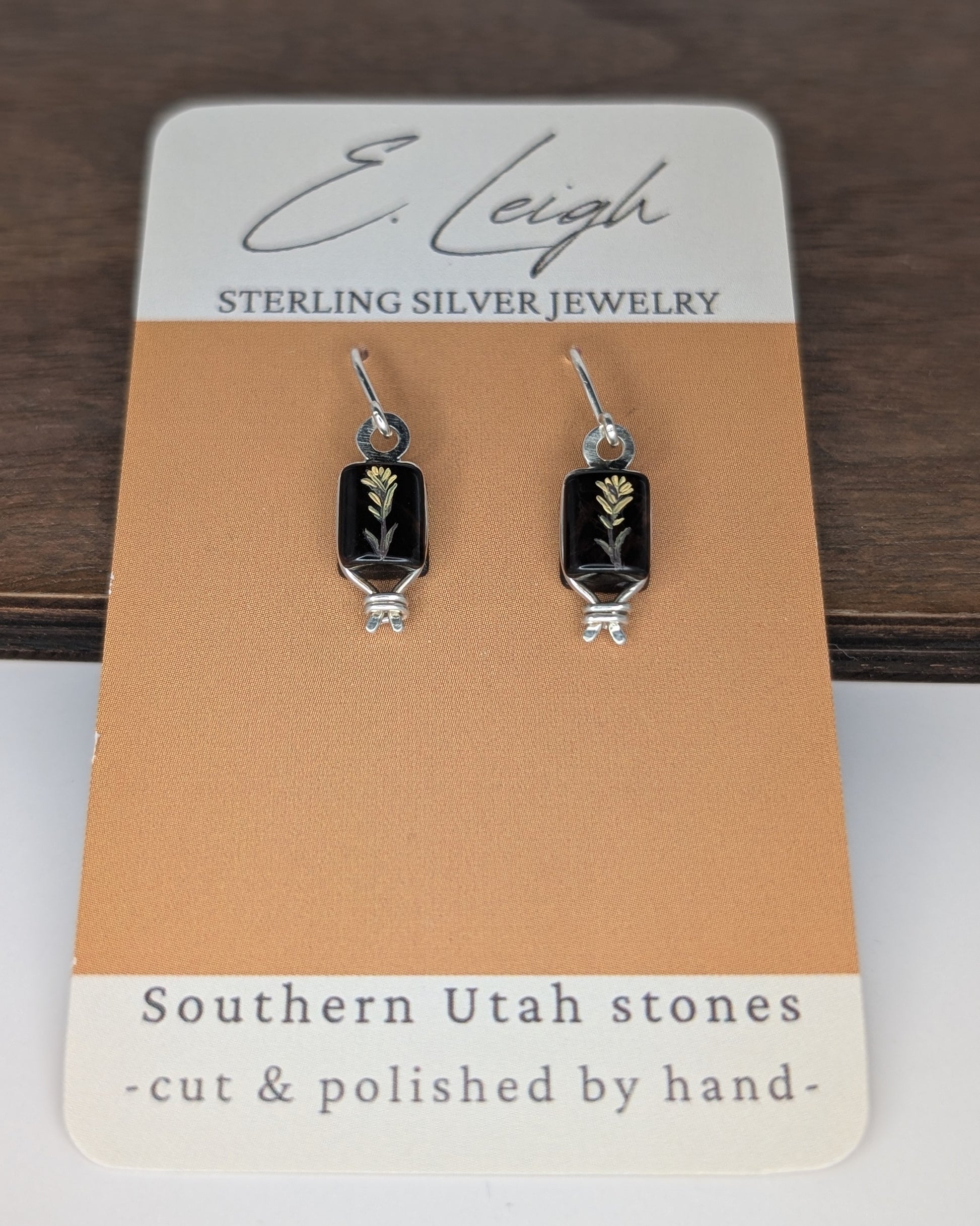 Hand-painted Indian Paintbrush flowers on small, rectangular obsidian stones. Each piece is made from stones personally sourced in Southwestern Utah, shaped by hand, painted with oil paint, and sealed with Gamblin varnish to protect the artwork.