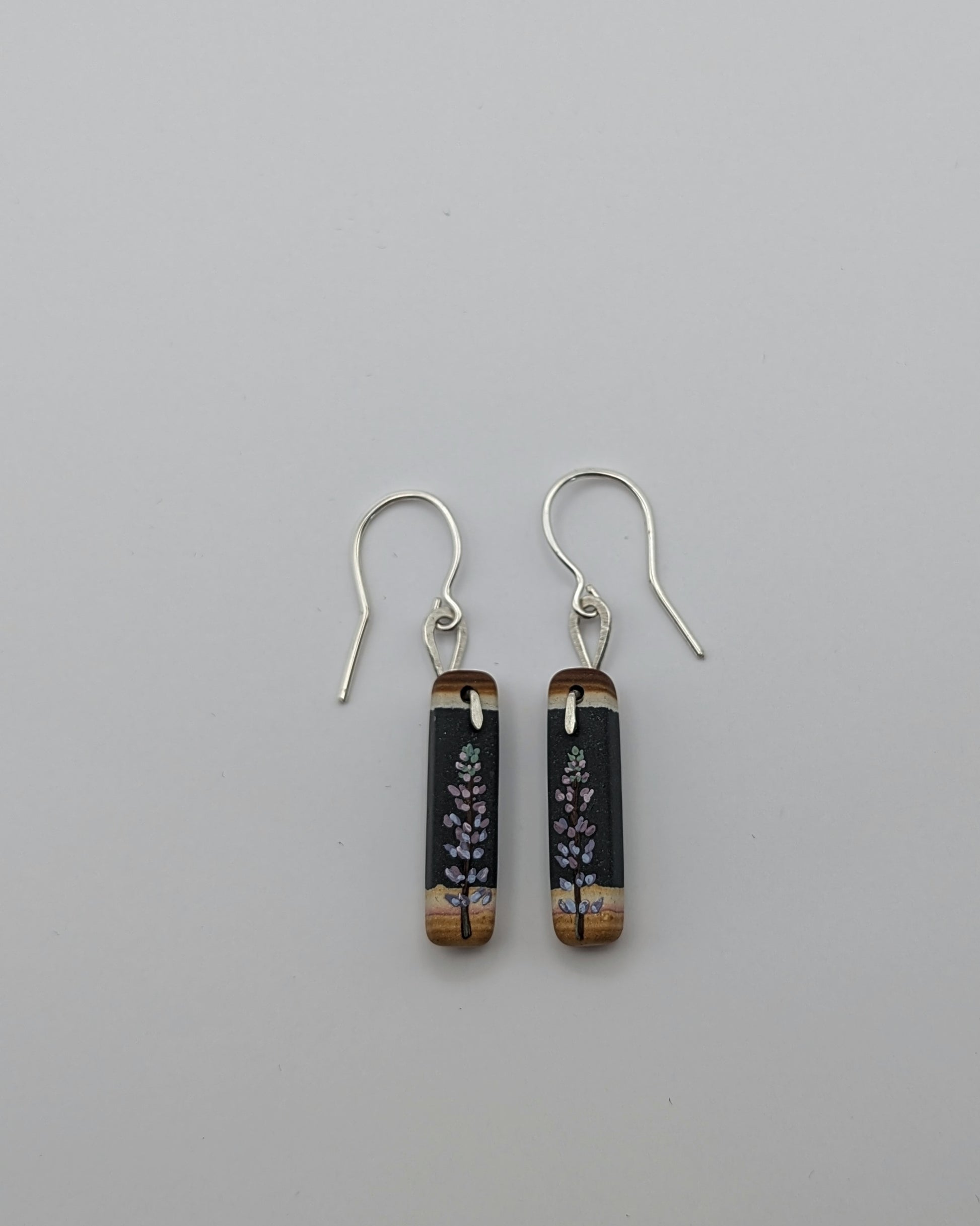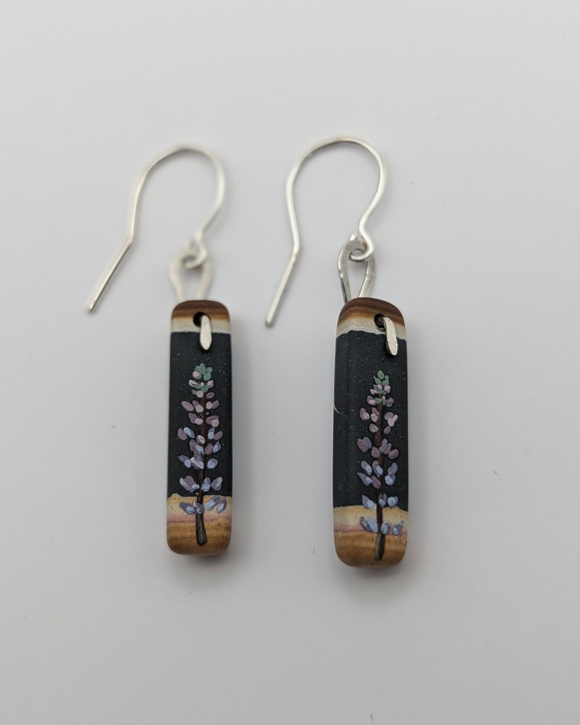 These earrings feature hand-painted oil depictions of the delicate Silvery Lupine, a wildflower native to Utah. The artwork is set on Wonderstone, a unique Utah stone known for its natural desert tones and distinctive patterns. Crafted with sterling silver.